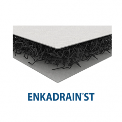 Enkadrain®ST é um geocomposto drenante de alto desempenho, que possui uma excelente capacidade drenante com baixos gradientes e sob cargas extremas. É constituído por um núcleo de monofilamentos entrelaçados, com um índice de vazios na ordem dos 95%, unidos a um filtro geotêxtil em ambas as faces. O geotêxtil é um material superabsorvente que retém em água até 10 vezes o seu peso, e evita também que partículas finas dos solos, substratos, betão, etc. entrem na camada drenante. A camada de filamentos entrelaçados permite a livre circulação de água e também contribui para o isolamento sonoro.